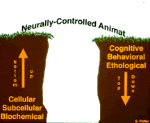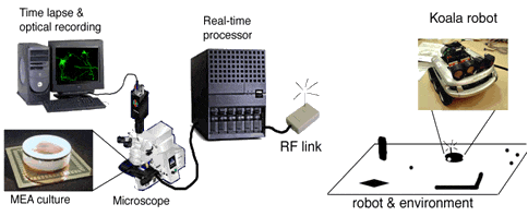 Cortical neurons from rats are dissociated and cultured on a surface containing a grid of electrodes (multi-electrode arrays, or MEAs) capable of both recording and stimulating neural activity. Distributed patterns of neural activity are used to control the behavior of the Animat in a simulated environment. The computer acts as its sensory system, providing electrical feedback to the network about the Animat’s movement within its environment.